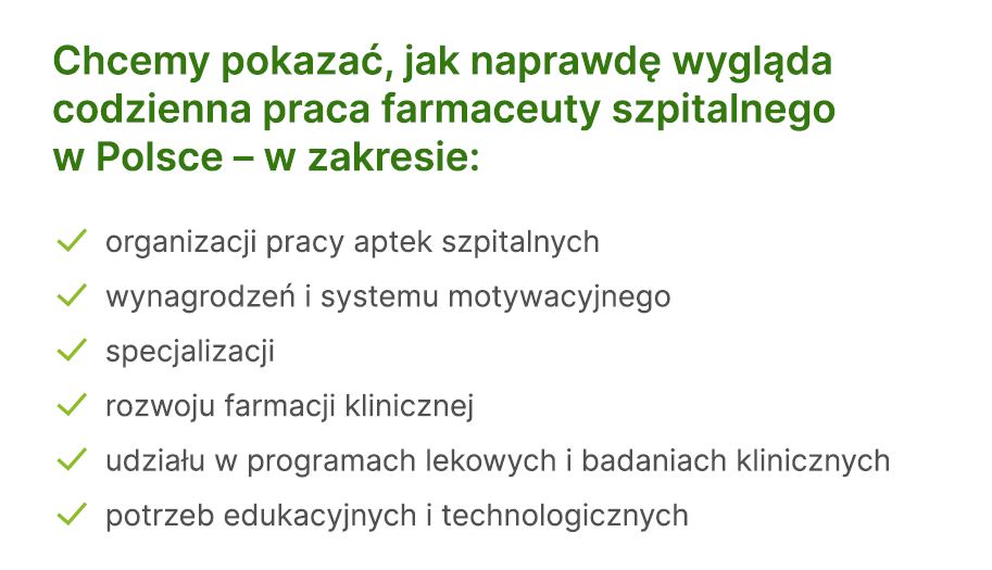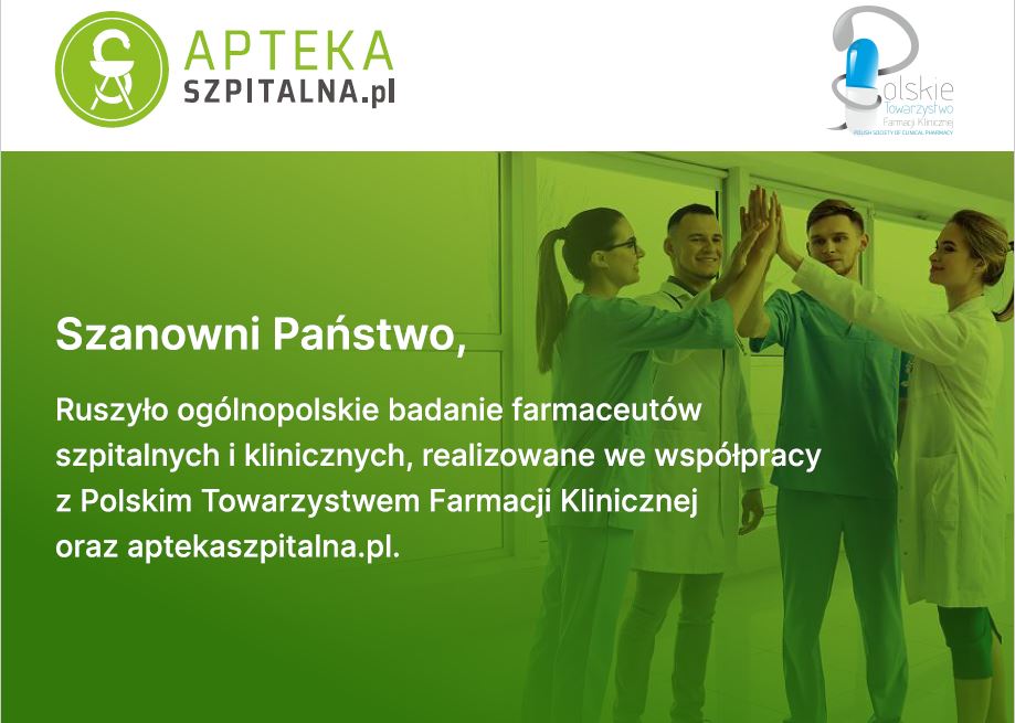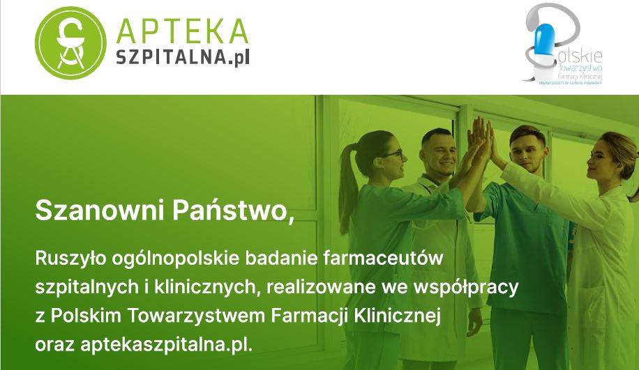 W odpowiedzi na tę potrzebę uruchomiono ogólnopolskie badanie farmaceutów szpitalnych i klinicznych, realizowane we współpracy z Polskim Towarzystwem Farmacji Klinicznej oraz serwisem aptekaszpitalna.pl.